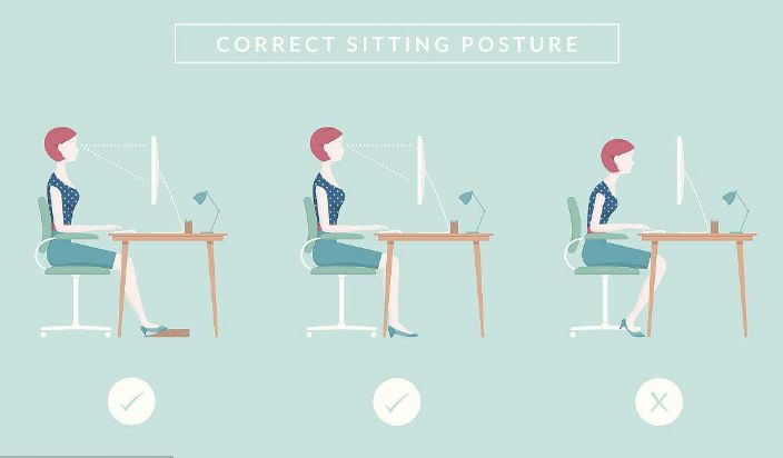 正确的坐姿应该尽可能保持自然的端坐位,头部略微前倾,保持头、颈、胸的正常生理曲线;期间,可升高或降低桌面与椅子的高度比例,以避免头颈部过度后仰或过度前屈;此外,在条件允许的情况下,可定制一面与桌面呈10至30度的斜面工作板,如此更有利于坐姿的调整。