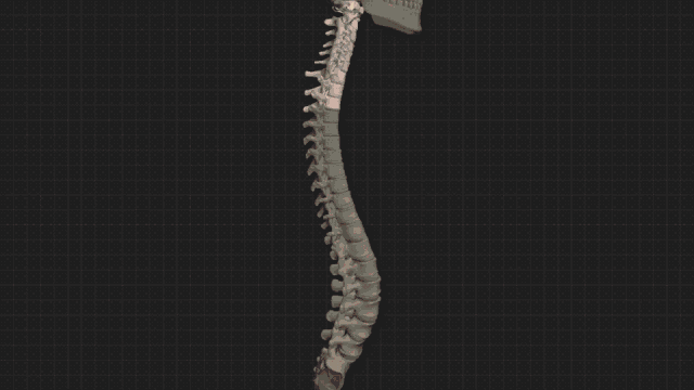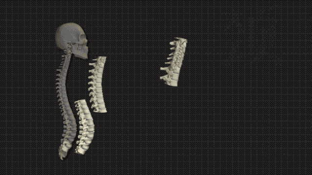 人体的脊柱由33块椎骨构成。人体的椎骨包括:颈椎七块,胸椎十二块,腰椎五块,骶椎五块和尾椎四块。椎骨可分前后两部,椎骨之间借椎间盘,韧带和关节等相连接。脊柱的椎体自上而下逐渐增大,从骶骨耳状面以下又渐次缩小。脊柱有四个生理性弯曲:颈曲、胸曲、腰曲、骶曲,增强了脊柱的弹性,在行走和跳跃时,有助于减轻对脑和内脏器官的冲击与震荡。