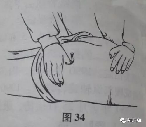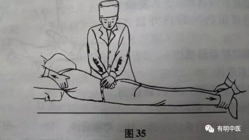 患者俯卧床上,放松肌筋。医者用单拇指触摸肌束改变的情况,可顺压损伤,痉挛变硬的部位,顺压4-5次后,改用掌根按照肌束走形压,新伤经过手法治疗,病人即感轻松。慢性损伤,用单拇指波动法,使粘连部位分开,能解除疼痛。同时配合伤科药物内服,即可治愈。(图34、35)