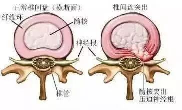 腰椎间盘,位于两个腰椎的椎体之间,厚度为8mm—10mm,由髓核、纤维环和软骨板三部分构成。而腰椎间盘突出症,是指椎间盘在某种因素下,髓核被挤压出来,压迫刺激周围神经根和血管,产生腰部疼痛,一侧下肢或双下肢麻木、疼痛等一系列症状。相较于椎间盘突出,膨出相对轻微,脱出更为严重。