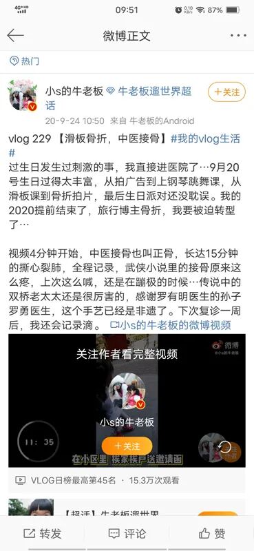 2020年9月24日患者牛女士在新浪微博分享了她在有明中医治疗骨折的视频,视频观看次数高达15.3万次,她的粉丝纷纷点赞转发并赞叹国家级非遗罗氏正骨法的神奇。经了解,原来牛女士是新浪微博亲子旅行博主@小S的牛老板,拥有300万粉丝的大V。