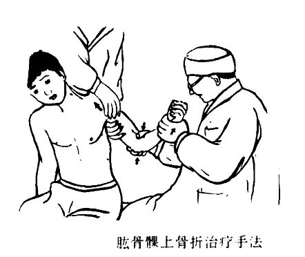 肱骨髁上骨折,采用三定点推挤按压推拉法,动作要娴熟,连贯,把肘关节后面环握内、外侧髁的手作为第一推挤力点,另一手环卡在近折端的手作为第二按压推拉力点,上臂自身为一支点,这样,定点准确,整复时得心应手又省力,病人少受痛苦,若定点不准, 而力量、方向角度也随着发生变化, 整复就会出现因难,或许整复不成功。