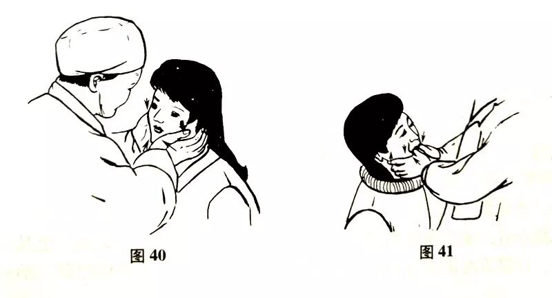 传统复位均系双拇指置于口内大臼齿面复位法,我们多采用口外复位法,不仅可避免患者过度张口引起下颌关节软组织的再度损伤及痛苦,而且也有于卫生。双侧脱位也可用单侧复位法,方法同前。此法随时随地均可使用,既经济又方便。(图40、41)