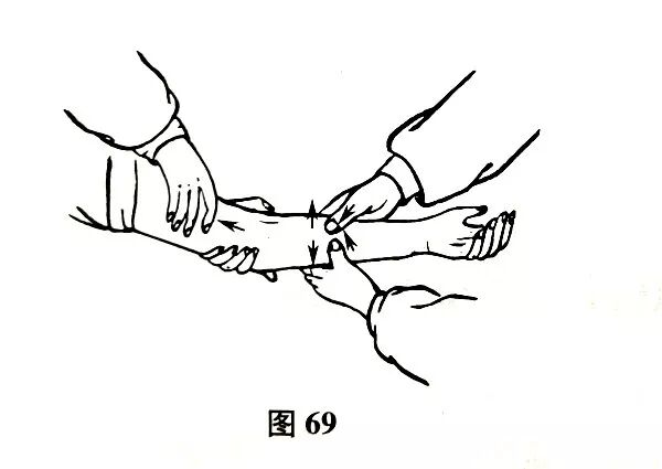 患者坐位,二助手牵拉患肢两端,医生双手握住肘关节处,在两助手牵拉的同时,医生双手轻轻外展肘部,同时用拇指挤压突起的桡骨头,即可复位。桡骨头复位后,医生双手再握住骨折部位,但尺、桡骨断端两侧不加力,以防骨间隙改变。此时两助手将前臂牵拉呈掌心向上位,医生双手拇指在上,余指在下。此时医生拇指轻轻下压,待骨折线对位后,在下余指慢慢向上提起即可复位。在做此法时,双拇指要注意分骨(图69),以保持骨间隙。如不是相等位的前臂双骨折,尺骨骨折线靠上,桡骨骨折线靠下时也可先接尺骨,然后再接桡骨。这两种接法,一般都是将桡骨头复位稳固后,再进行接骨。