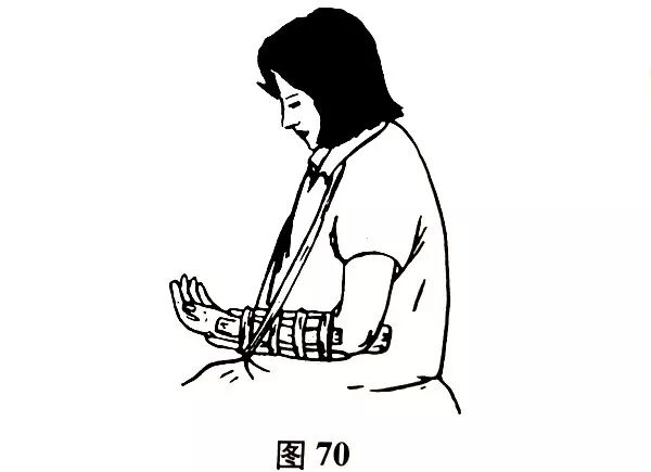 复位后用备好的夹板进行包扎固定。固定时屈肘,先将肘关节用绷带包扎后,再用夹板固定,在骨间隙的上下面要加圆柱形的分骨垫,以防骨间隙改变。包扎固定松紧要适宜,然后将伤肢悬吊在胸前(图70)。