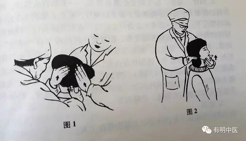 患者端坐位。助手站在患者一侧,一手托住患者的下巴,另一手托于枕骨部,双手向上引拔。术者站在患者背后,一手重叠放在助手手背上,两手同时相对用力推、扳,即可复位。但手法要轻巧缓慢,不可用力过猛,也不要急于求成,以免造成不良后果。陈旧性脱位,一人即可操作,但双手须有上拔的引力,操作方法同前所述。本法稳妥可靠,若用法得当,会有明显疗效。(治疗手法参考图1、图2)