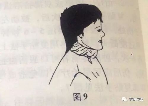 复位后,用脖套固定,口服活血止痛药物,4周后可适当功能锻炼。如图9所示。