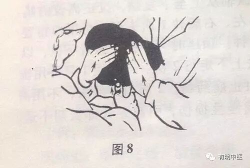 患者端坐位,医生站在患者背后,一助手站在患者前面,用双手捧住患者头部两侧向上拔,同时医生用一手拇指或者双手拇指顶住脱位椎体的棘突隆起部位,向脱位相反的方向徐徐推压,若指腹感到轻度的声音或拇指下有滑动感,即已复位。伴有骨折时,手法更要轻,必须谨慎小心,会有好的疗效。治疗手法如图8所示。