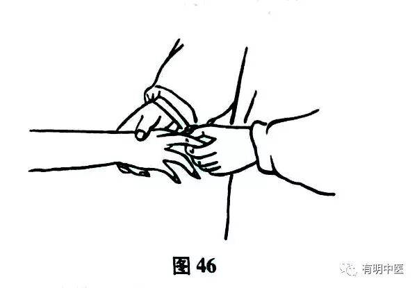 术者用拇指与食指捏住患者拇指呈过伸拉。做持续牵引。另一手拇指压在患者拇指基底部,并推向远端,与掌骨相对,然后屈曲拇指,复位即告成功(如图46所示)。复位后要包扎固定1-2周,口服活血止痛药。