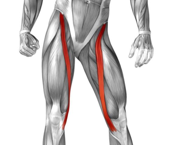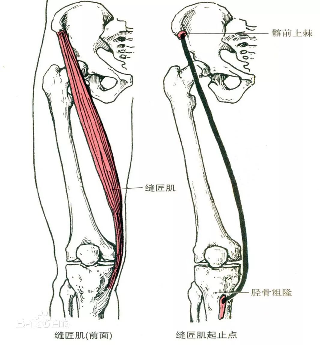 缝匠肌呈扁带状,是人体最长的肌,起自髂前上棘,斜向内下方,经膝关节内侧,止于胫骨上端内侧面。缝匠肌是使腿部弯曲的细长的大腿肌肉,负责将膝盖举起、放下与盘腿的动作。