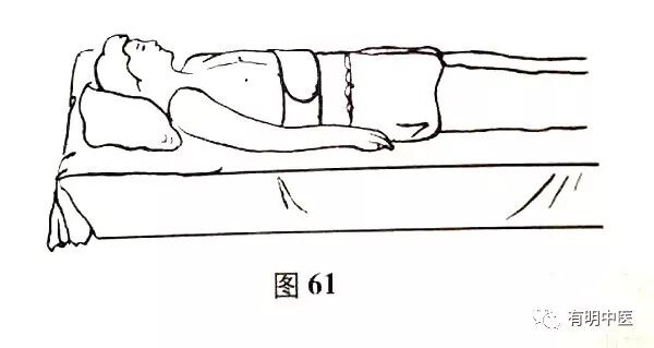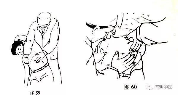 根据损伤部位的不同可选用不同的治疗手法。以前侧部肋骨骨折为例,患者端坐于方凳上,医生站在患者侧后,嘱患者将患肢患侧的上肢举起后扳住颈部的同时,另一手掌推骨折下方的部位,双手对抗牵拉,尽量达到顺肋骨生理走行方向缓缓施法。此法能将陷者复起,突起者可用手掌轻轻下压复平,治疗如图59、60、61所示。