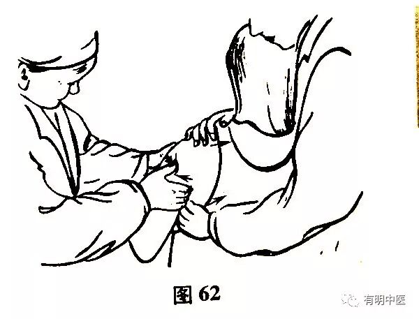 嘱患者坐在方凳上,助手二人,一助手用纱布1米从患肢腋下穿出适当用力向上牵拉,同时另一助手向下牵拉前臂即两助手行徐徐对抗牵拉。此时医生双手拿住骨折部位,外展型,用双手拇指轻轻推压的同时,余四指将远端骨折处向外挤压,双拇指和余四指向恢复解剖部位做对抗性的挤压,即可复位。此手法要在牵拉骨折位重叠解除后进行,手法不宜过重。内收型与外展型遵其手法即可(图62)。