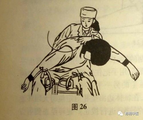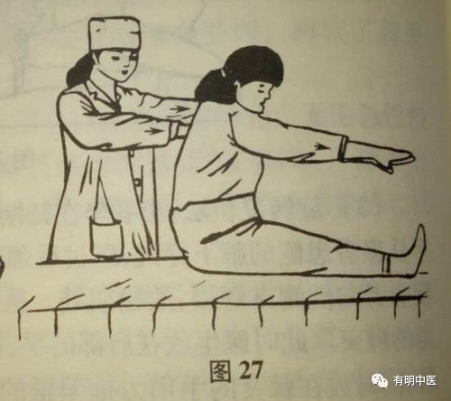 患者坐在治疗床上,两腿伸直,双腿并拢。足尖等齐,双手向前略伸。嘱患者放松肌筋,医者站在患者背后。双手扶持患者双肩部,向前推动上身来回晃动3-4次。也可一助手牵拉患者双手和医者动作协调,但不能用力过猛,应缓慢用法。(图27所示)