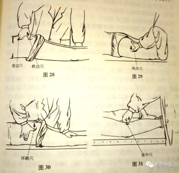(1)点穴:中心型、腰5骶1椎间盘脱出的,点秩边、坐骨部、委中。腰4、5椎间盘脱出的,点环跳、风市、委中,阳陵泉、昆仑。每穴10秒钟后从臀部至足推拿松懈5分钟。环跳可屈肘重点10秒钟后略停,再点1次,其余均用中度点压。