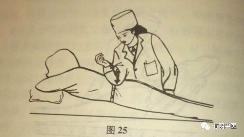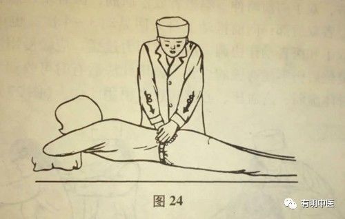 患者俯卧位,肌筋放松,医者站患侧一边。用前臂平面鹰嘴骨处,放患处两椎体之间下压,由轻到重,以能忍耐为度。每次重压1分钟。松懈1次患部周围的组织,重者可连续施法3次。陈旧性也可在一助手握双踝向下牵引的同时腰部加压,此法能加大椎间隙,使纤维环产生一种弹性回旋力,即可使髓核还纳,纤维环复原,远离神经根。(图24、图25所示)
