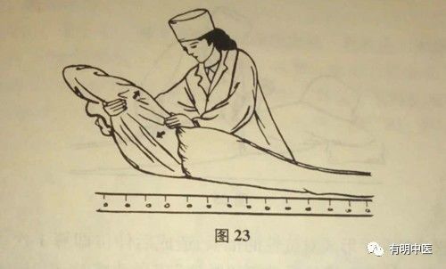 俯卧位,嘱患者全身放松,医者站于患侧一方。一手放在健侧肩部,另一手放在棘突旁。用掌根部或拇指紧紧顶住棘突向健侧推的同时,放在健侧肩部的手成相反方向的推扳。脊柱不伴后凸畸形者,患者上身不要回旋,以患者的耐受力为度,一般均要过度矫正。扳住稳定一分多钟,如手感腰部滑动及“咕喽”、“咕咚”声响,即已还纳。如一次没有成功,还原后再扳一次。病程远可连续施法三四次。(图23)