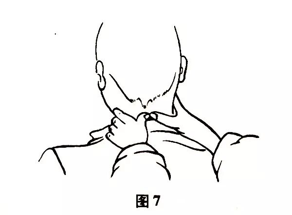 用单或双拇指沿纵轴从上至下复贴,拨正离位的肌筋。复贴手法4-5次后,被动左、右转1次头部,再用拇指置于伤处,轻度向前顶压5-6秒钟。顶压时一手托住患者下巴,以免过度低头,然后再用复贴手法上下走行2次。同时用1号外用洗药6次,肿胀疼痛者可口服活血止痛药物。2周内少低头,不用高枕。伤后应尽早治疗,以免造成慢性损伤,引起颈背部长期不适。项部复贴手法见图7。