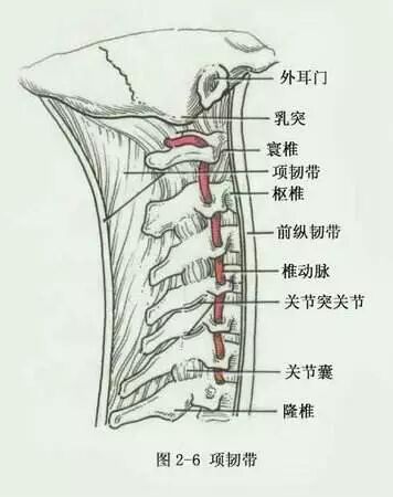 项韧带指在颈部从颈椎棘突尖向后扩展成三角形板状的弹性膜层。项韧带常被认为与棘上韧带和颈椎棘突间韧带同源,向上附着于枕外隆凸及枕外嵴,向下达第7颈椎棘突并续于棘上韧带,是颈部肌肉附着的双层致密弹性纤维隔。