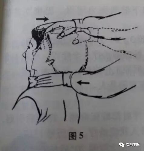 一般手法后即感轻松、舒适、病可除半。陈旧性脱出症,一次复位不成功,可采用多次复位,手法同前(如图3、图4、图5所示)。如伴有头痛、头晕、失眠、视力模糊时,可用拇指点压风池、安眠穴位,手法中强度,2-4秒。手法后头部即感轻松舒适,眼睛明亮。