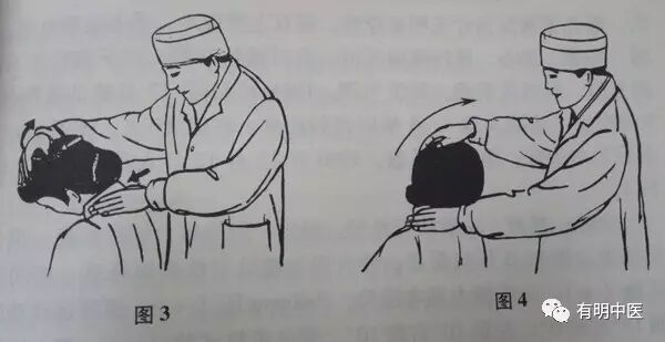 患者端庄,医生站立在患者背后。一手放在头顶部,将头推向健侧前方,另一手拇指置于偏歪棘突处,放在头部的手在轻轻推动的情况下,慢慢向前或突出的一方回旋,直至后仰头位。同时置于棘突的拇指,向健侧前方适度推、拨棘突,若拇指下有“咕噜”滑动感,既已复位。复位后,松懈颈肩部紧张的组织。