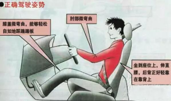 3.把座位适当地向前移,尽量让胸口靠近方向盘,但不要影响转向。同时,座椅靠背后倾角度不要太大,以100度左右为宜,并调整座位与方向盘之间的高度。座位过低或过高都不合适,过低双肩会有上耸的感觉,过高则容易使腰椎过度拉伸,从而增加了腰部的负荷;