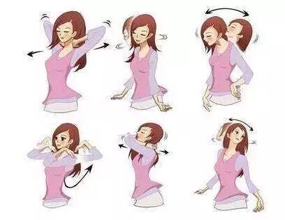 5、提肩缩颈:双肩慢慢提起,颈部尽量往下缩,停留片刻后,双肩慢慢放松地放下,头颈自然伸出,还原自然,然后再将双肩用力往下沉,头颈部向上拔伸,停留片刻后,双肩放松,并自然呼气。注意在缩伸颈的同时要慢慢吸气,停留时要憋气,松肩时要尽量使肩、颈部放松。回到自然式后,再反复做4次。