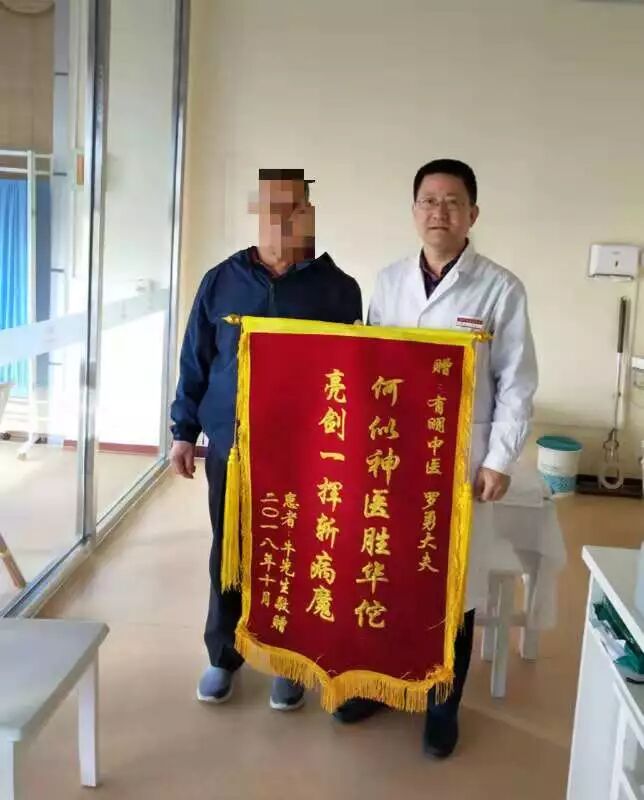 2018年10月29日上午,患者牛先生来到有明中医,送上锦旗,对罗院长表示衷心感谢。