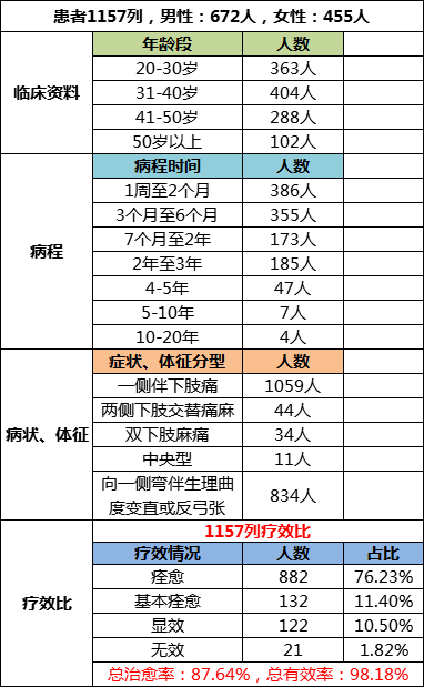 多年来,我们根据腰椎间盘突出症的临床分期分型不同情况,选用了不同的治疗方法,提高了治疗效果,疗效也得到巩固。我们收治了1157列,进行了临床编组,临床情况总结如下: