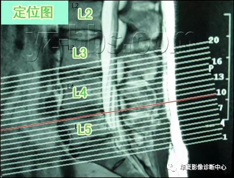 每个数字代表一个通过该平面所拍的MRI图像。这张片子中的图像层只涵盖了L3, L4, 及L5三节。 例如,层11 (标为红色的第10层上的一层)正好穿过L4椎间盘。如果你L4椎间盘有问题,就看此层图像。 图层18信息也非常有用,它对应着L3椎间盘。对于椎间盘很薄的病人,层的厚度应最好更薄一点(6mm),以便保证其正好穿过变薄的椎间盘。