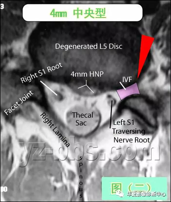 “后部神经结构”包括过往神经根(Traversing Nerve Roots)、硬膜囊(Thecal Sac)及发出神经根(Exiting Nerve Roots)。发出神经根位于椎间孔(看图中IVF粉红色区)内,在此图像中看不到。如果你发挥点想象力,你可以在图中找到一个象“米老鼠”样的图像,硬膜囊是米老鼠的头,两个过往神经根是米老鼠的耳朵。