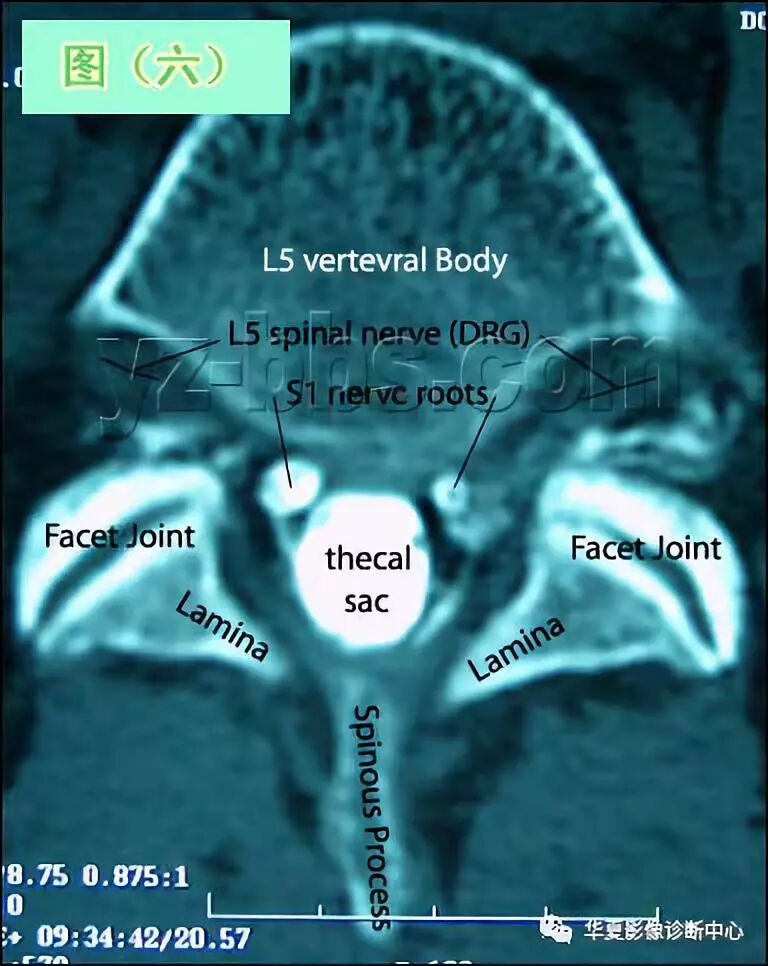 图(六)的是来自紧靠L5椎间盘上,椎体下的一层(记住不管是CT还是MRI都是穿过脊柱不同平面的薄切片)。因为此层是椎间盘水平面上的一层,故只能看到后部神经结构而不能看到椎间盘本身。 注意,亮白色的环状突起(未标明),表示了椎体的外轮廓(图片上部)。