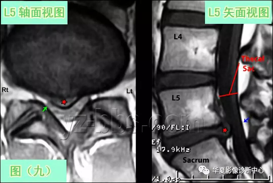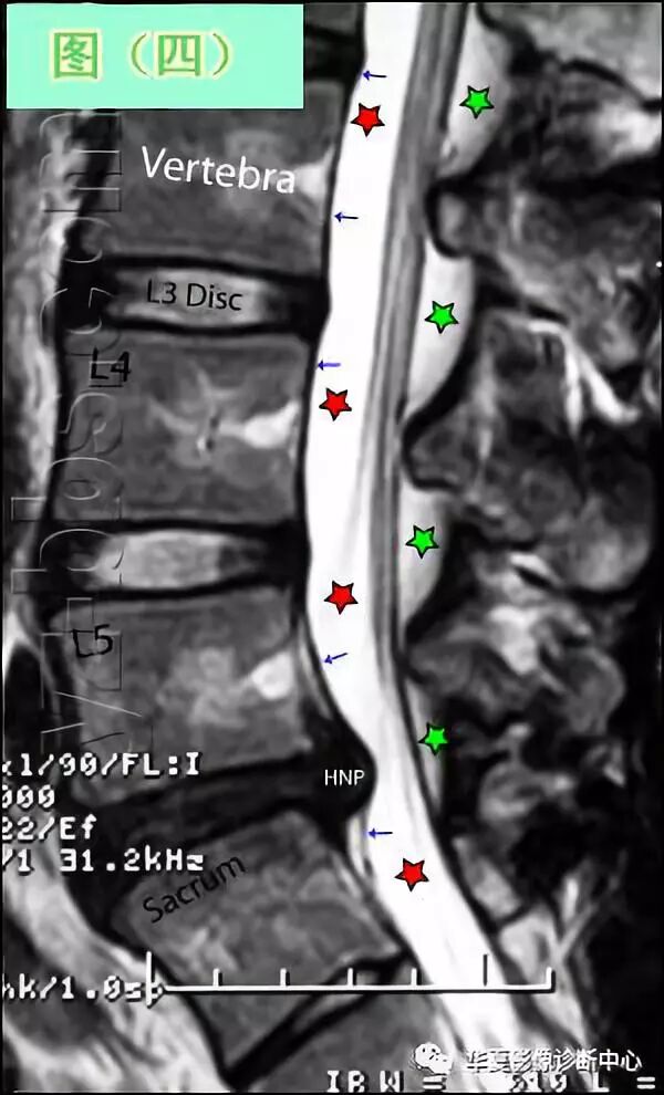 在轴状面及矢状面图(蓝箭头与红五星之间)可观察到硬膜囊有来自这个大的突出的中重度压迫。