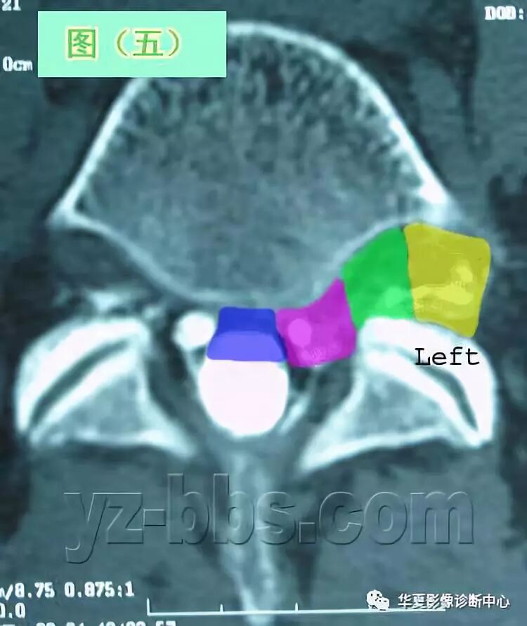 粉色区域:这里是“旁中央区”或称侧隐窝,位于中央区紧外侧。因为此区的后纵韧带不象中央区那样厚,故常在此区出现椎间盘突出。事实上,这是椎间盘突出发生的头号位置。常常看到过往神经根在此区被突出的椎间盘接触到、被移位和被压迫。(请记住,发生在侧隐窝的L5椎间盘突出压迫的是过往神经根S1,而不是位于椎间孔的发出神经根L5)
