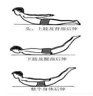 俯卧,头,双上肢,双下肢后伸,腹部接触床的面积尽量小,呈飞燕状。保持5-10秒,重复20次/组,2-3组/天。