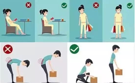 搬重物时,先做好准备姿势,不要突然用力;弯腰捡东西的时候先下蹲;搬提重物时尽可能双侧用力,不要把重心倒向一边。